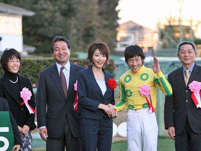 ![]() 眞鍋かをりさんとの記念撮影に照れまくりの勝利ジョッキー |